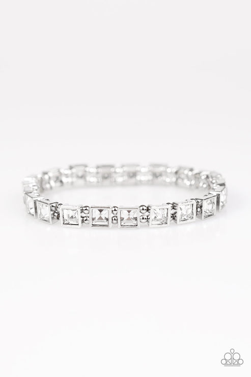 Chiseled into elegant squares, glittery white gems are nestled into sleek silver frames and threaded along elastic stretchy bands for a refined look.