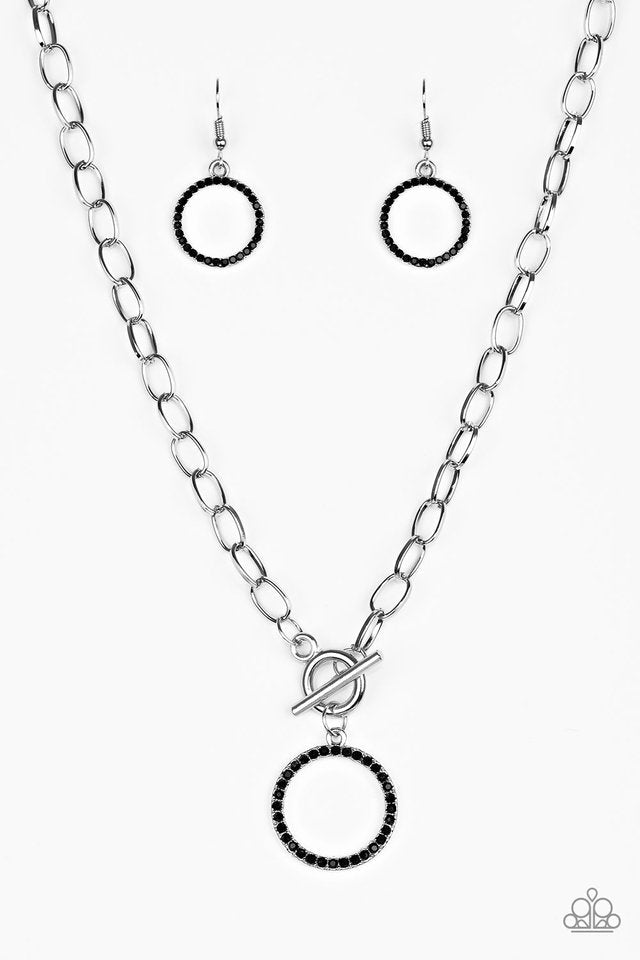 Encrusted in glittery black rhinestones, a bubbly silver pendant swings below the collar for a colorfully casual look. Features a toggle closure. Sold as one individual necklace. Includes one pair of matching earrings.