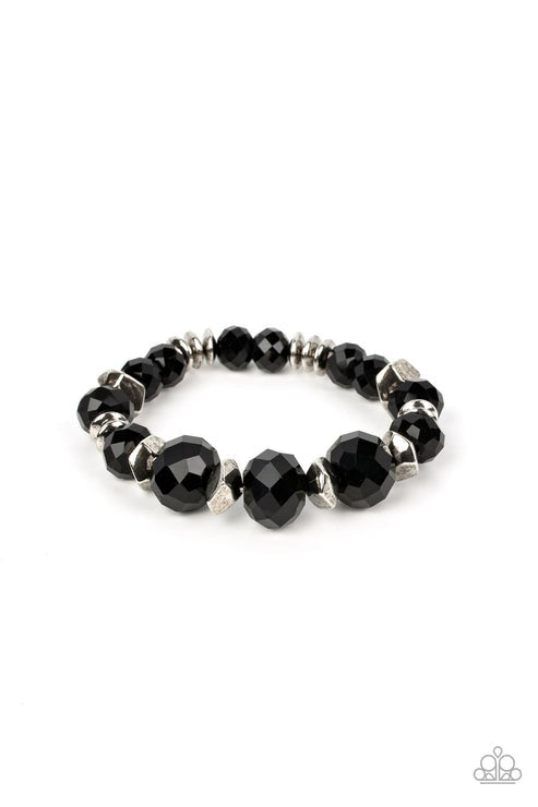 Separated by silver discs and faceted silver accents, faceted black crystal-like gems are threaded along stretchy bands around the wrist for a stellar statement.