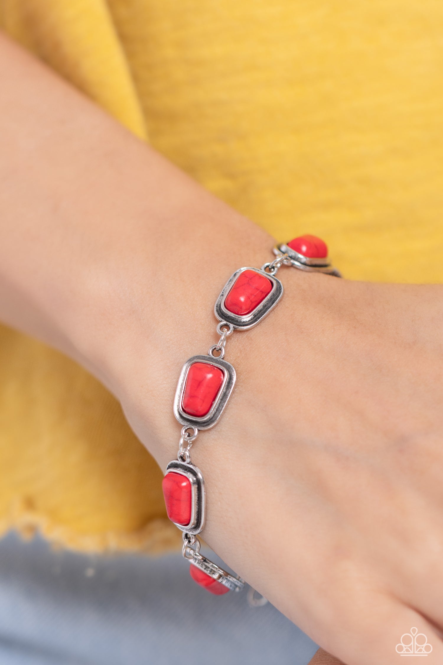 Encased in silver fittings, trapezoidal red stones delicately fan out around the wrist for a dramatic pop of color. Features an adjustable clasp closure. As the stone elements in this piece are natural, some color variation is normal.