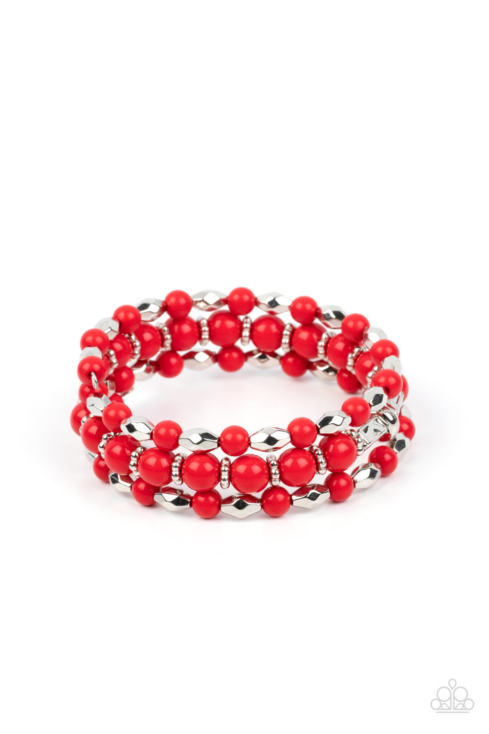 A mismatched collection of faceted silver beads, studded silver rings, and fiery red beads are threaded along a wire that coils around the wrist, creating a colorful infinity wrap style bracelet.