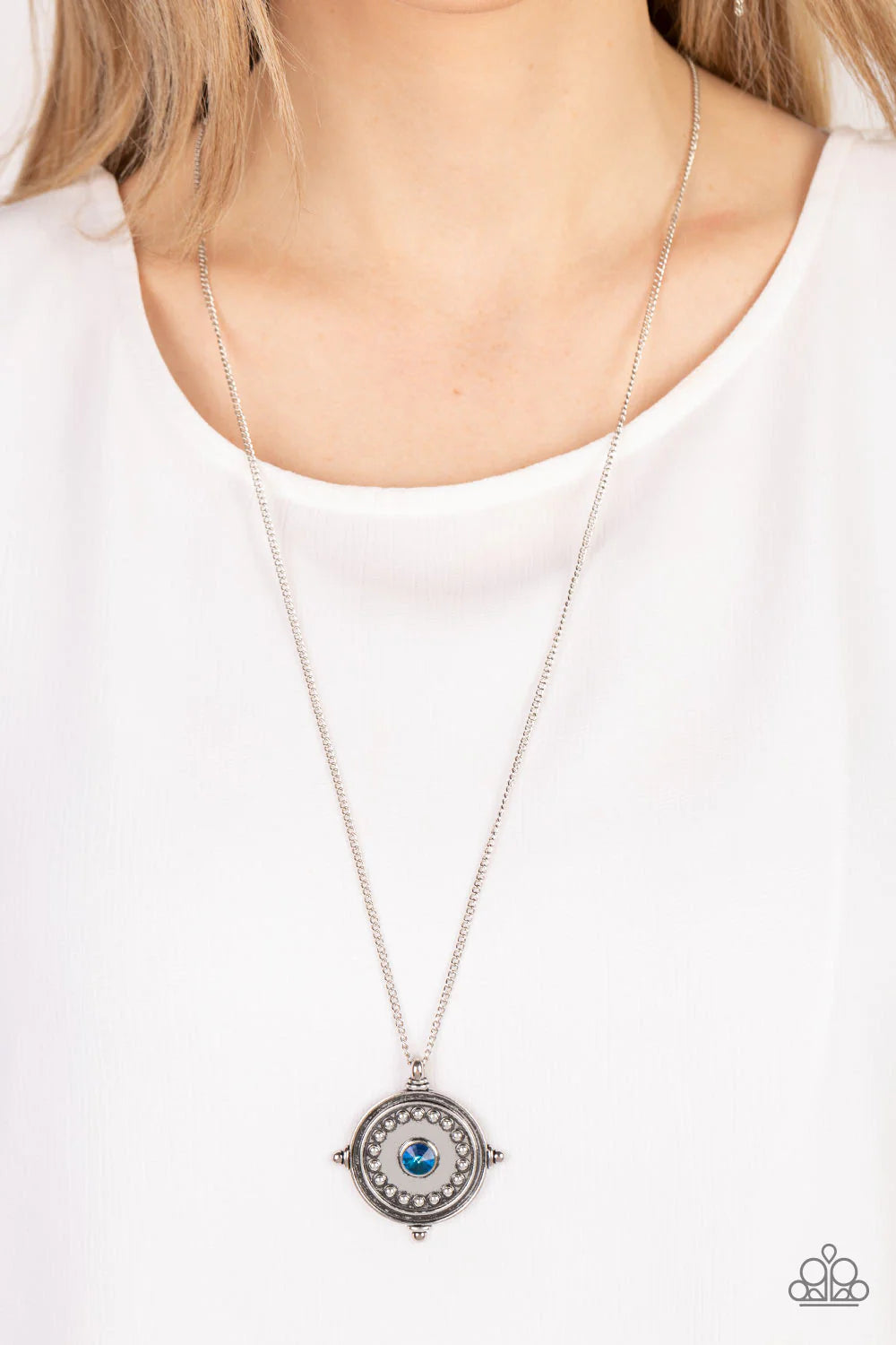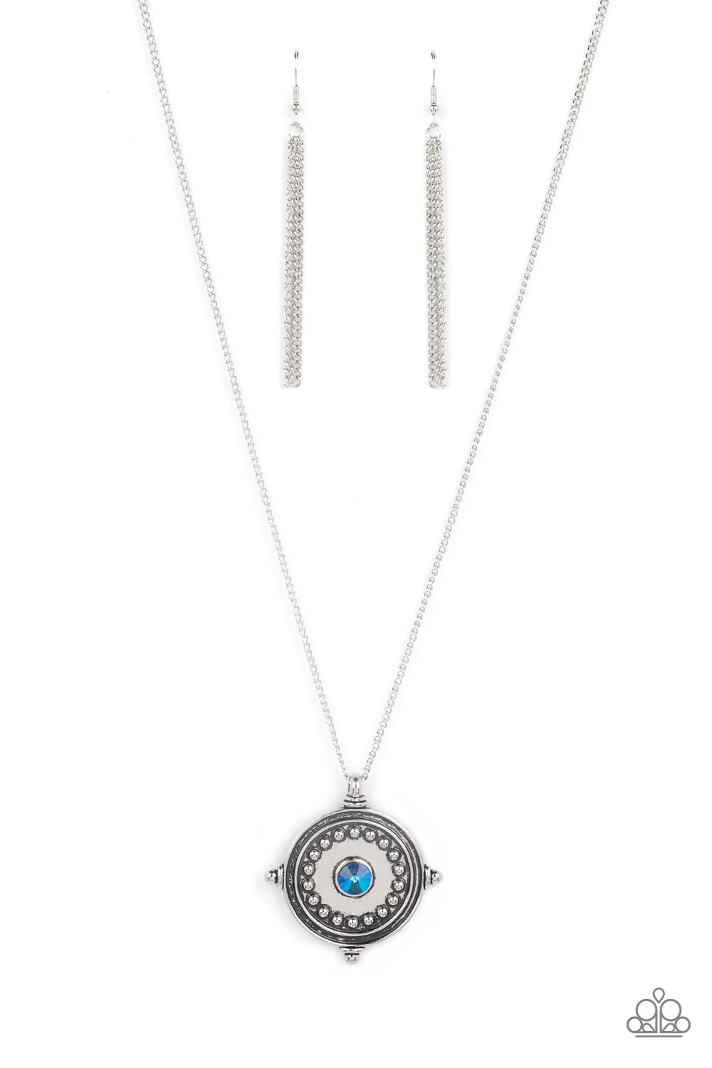 An iridescent blue rhinestone is pressed into the studded center of a compass inspired frame, creating a stellar pendant at the bottom of an extended silver chain. Features an adjustable clasp closure.
