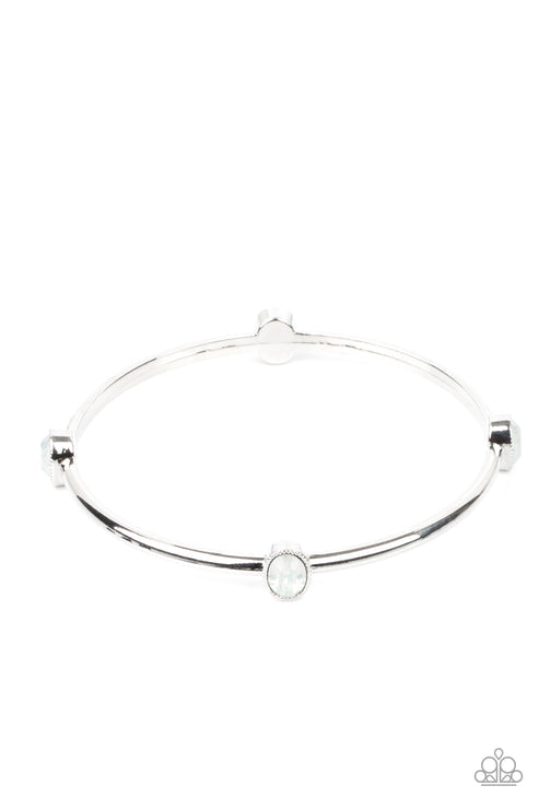 White oval opal rhinestones embellish a dainty silver bangle, creating an enchanted shimmer around the wrist.