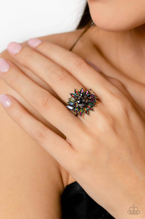 Marquise-cut rhinestone petals, splashed in an oil spill finish, fan out in an abstract manner around a hematite center. Dramatic emerald-cuts, set in a similar oil spill shade, fall in line along twisting bands of silver, exploding into a stellar centerpiece atop the finger. Features a stretchy band for a flexible fit. Due to its prismatic palette, color may vary.
