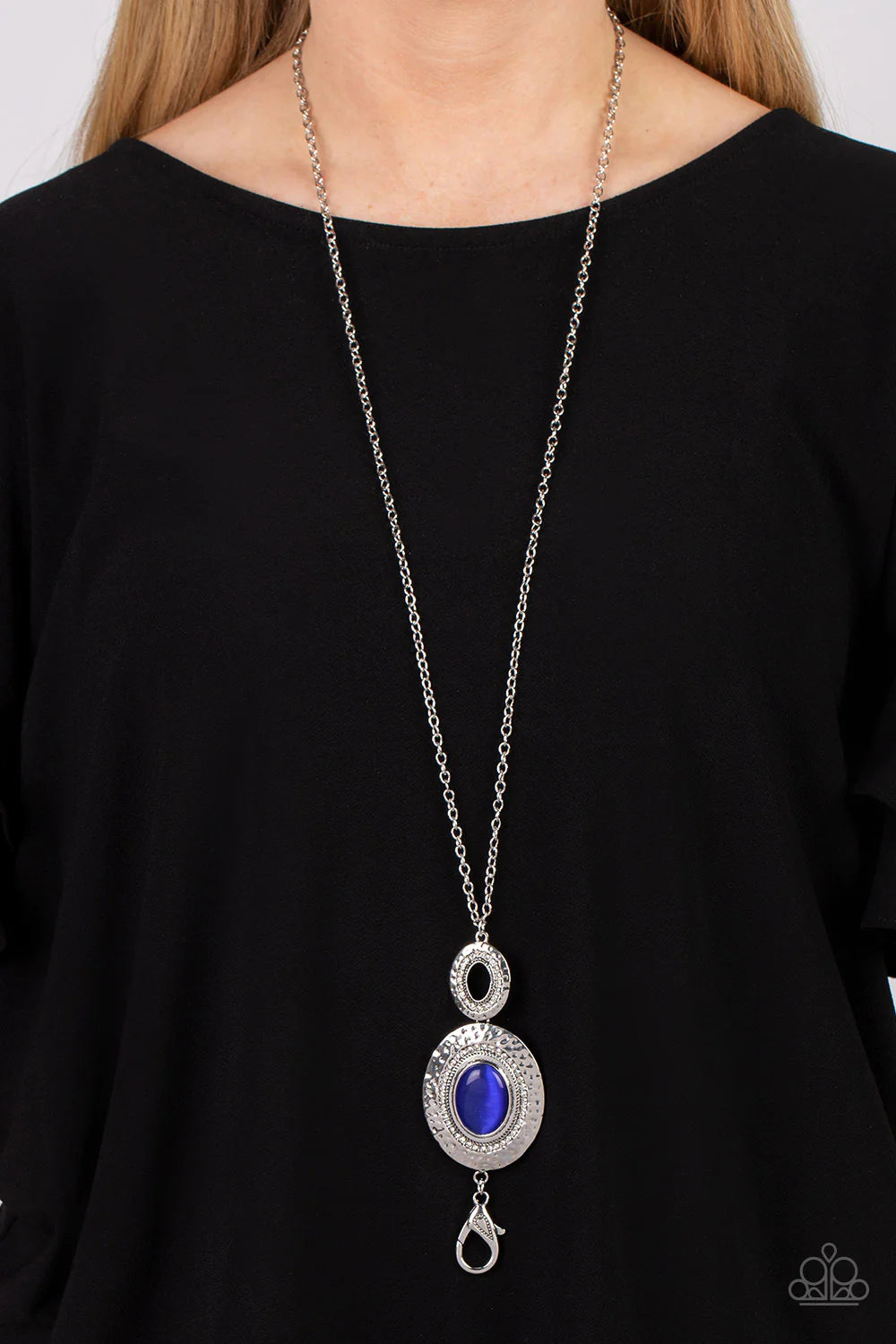 A pair of silver oval-shaped frames are hammered in texture and suspended from the bottom of a long silver chain. The smaller, uppermost frame is open, with a ring of rhinestones lining its inner border, which gives way to the larger silver oval below. A large blue cat's eye stone sits boldly in the center of the large frame, adding a pop of color to the shimmery display. A lobster clasp hangs from the bottom of the design to allow a name badge or other item to be attached. Features an adjustable clasp closure.