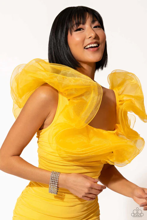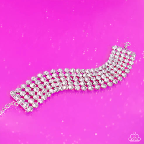 Suspended from sleek, dainty silver bars, five linked rows of glassy white rhinestones stack into a blinding display around the wrist for a jaw-dropping look. Features an adjustable clasp closure.