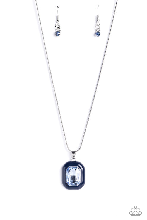 An oversized, Summer Song emerald-cut gem is bordered by a frame of darker blue, creating a bright pendant that swings from the bottom of a silver snake chain. Features an adjustable clasp closure.