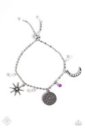 Dainty white stones and an amethyst bead swing from a dainty silver chain, alternating with three wanderlust-inspired charms. The charms include a three-dimensional, studded silver star and a crescent moon, each dotted with opalescent rhinestones, along with an antiqued silver disc embossed with compass details. Features an adjustable sliding closure. As the stone elements in this piece are natural, some color variation is normal.