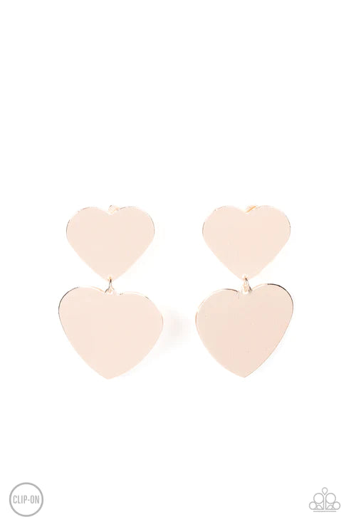 Featuring a shimmery scratched finish, an oversized rose gold heart charm swings from the bottom of a smaller rose gold heart charm, resulting in a flirtatious lure. Earring attaches to a standard clip-on fitting.