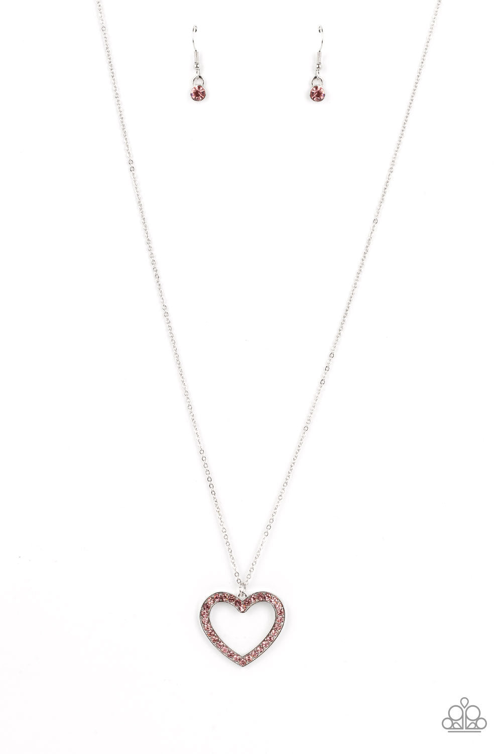 A silver heart-shaped silhouette is outlined with a border of light rose rhinestones and suspended from the bottom of a long silver chain. The colorful rhinestones infuse the simple concept with irresistible sparkle, bringing a hint of glam to the charming design. Features an adjustable clasp closure.