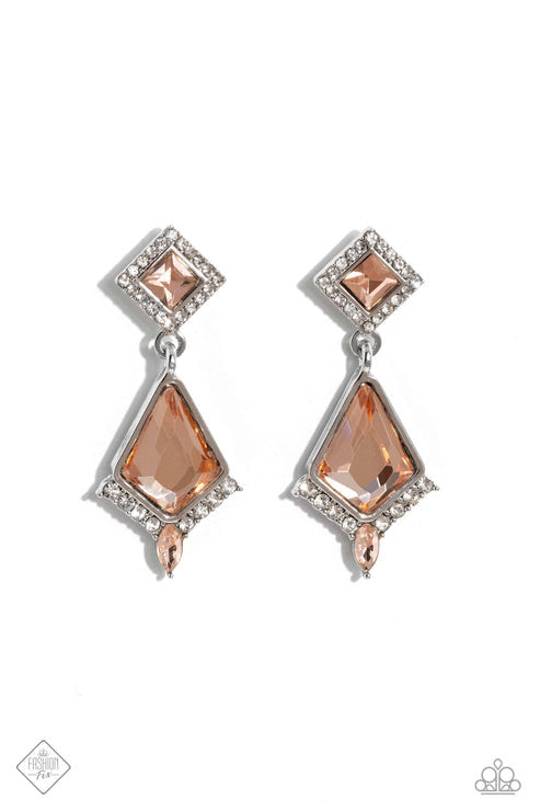 A peach square-cut gem is wrapped in glitzy white rhinestones and tilted on its side, creating a bold anchoring point. A large kite-shaped gem in the same peachy hue swings below, fiercely showcasing the sparkling rhinestones that line its bottom edge. A solitaire marquise-cut gem drips between the lustrous display, adding a surprising pop of color in an elegant finish. Earring attaches to a standard post fitting.