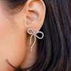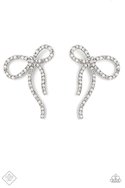 Adorned in sparkling white rhinestones and dainty white pearls, a high-sheen band of silver curls and loops into a stunning bow, creating a charming lure. Featured in the center of the classy design, a dainty white rhinestone flower adds a floral finish to the stunning display. Earring attaches to a standard post fitting.
