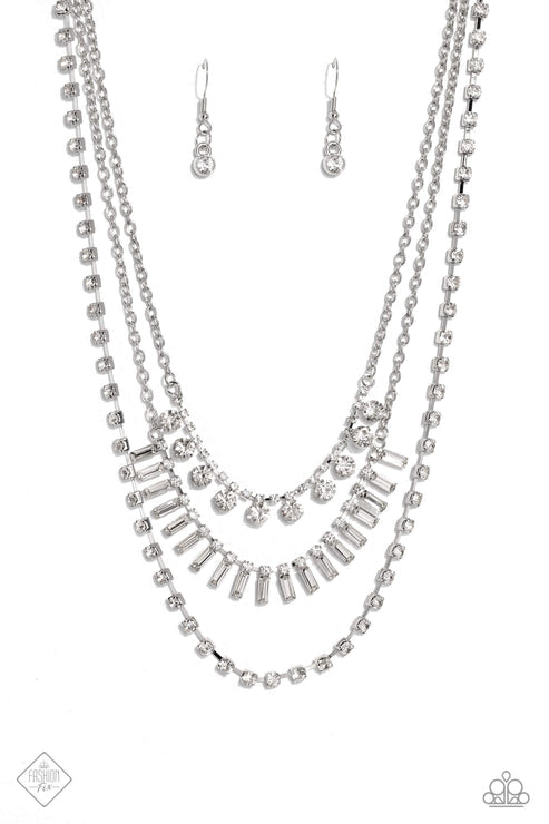 Three silver chains fall into haphazard layers across the chest, creating a radiantly edgy display. On the uppermost chain, a row of solitaire rhinestones emerges from a section of small, white, square-cut gems. The centermost chain showcases a row of emerald-cut, white gem bars that fan out from tiny classic rhinestones above. Finally, a strand of classic square-cut rhinestones completes the layered design, scattering light in every direction as it bounces off their faceted surfaces. Features an adjustable clasp closure.