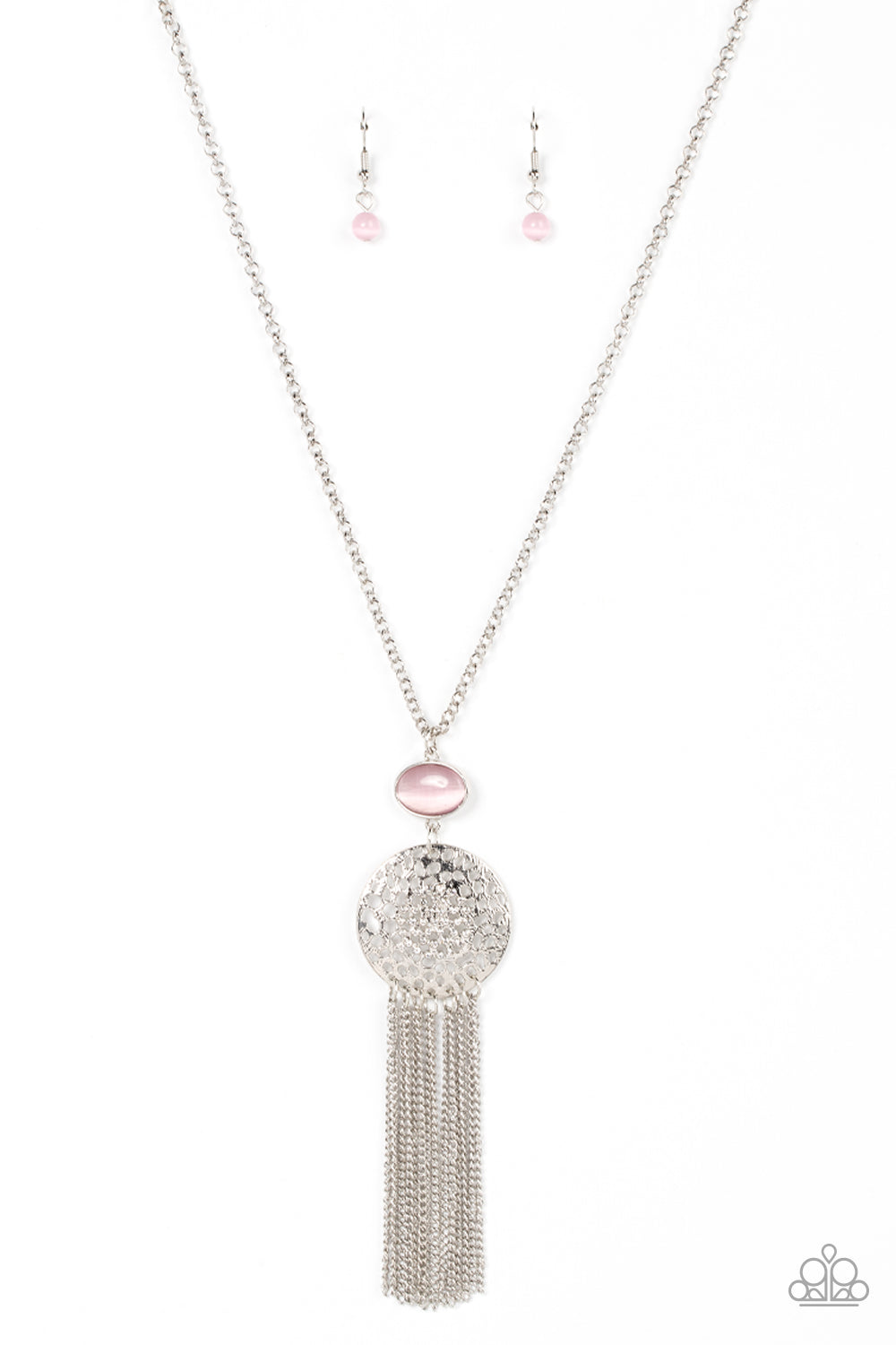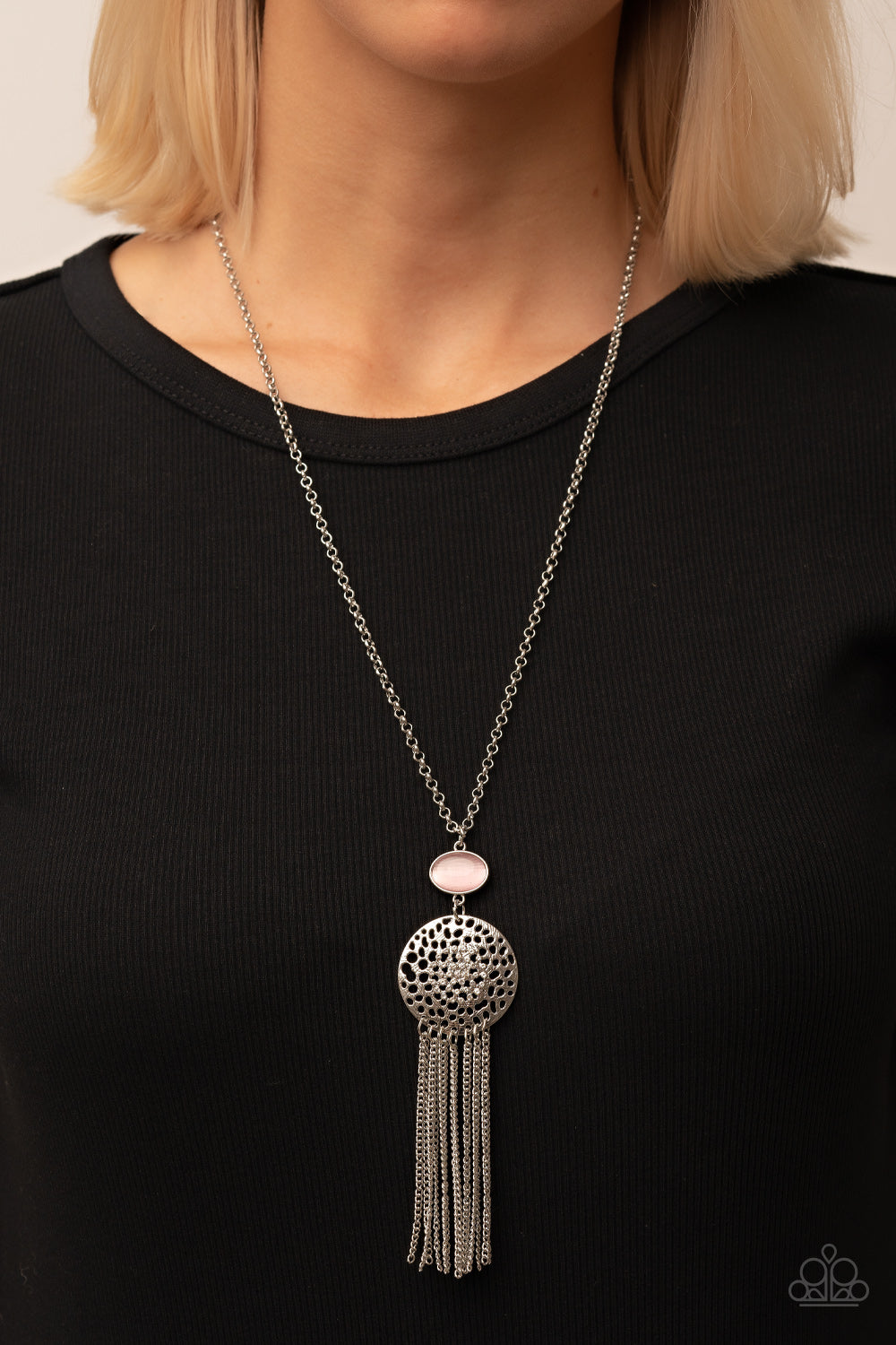 Dainty white rhinestones are sprinkled across the center of a silver disc featuring abstract circular cutouts. Infused with a shimmery silver chain tassel, the airy silver medallion is suspended from a glassy pink cat's eye frame at the bottom of an extended silver chain for a whimsical finish. Features an adjustable clasp closure.