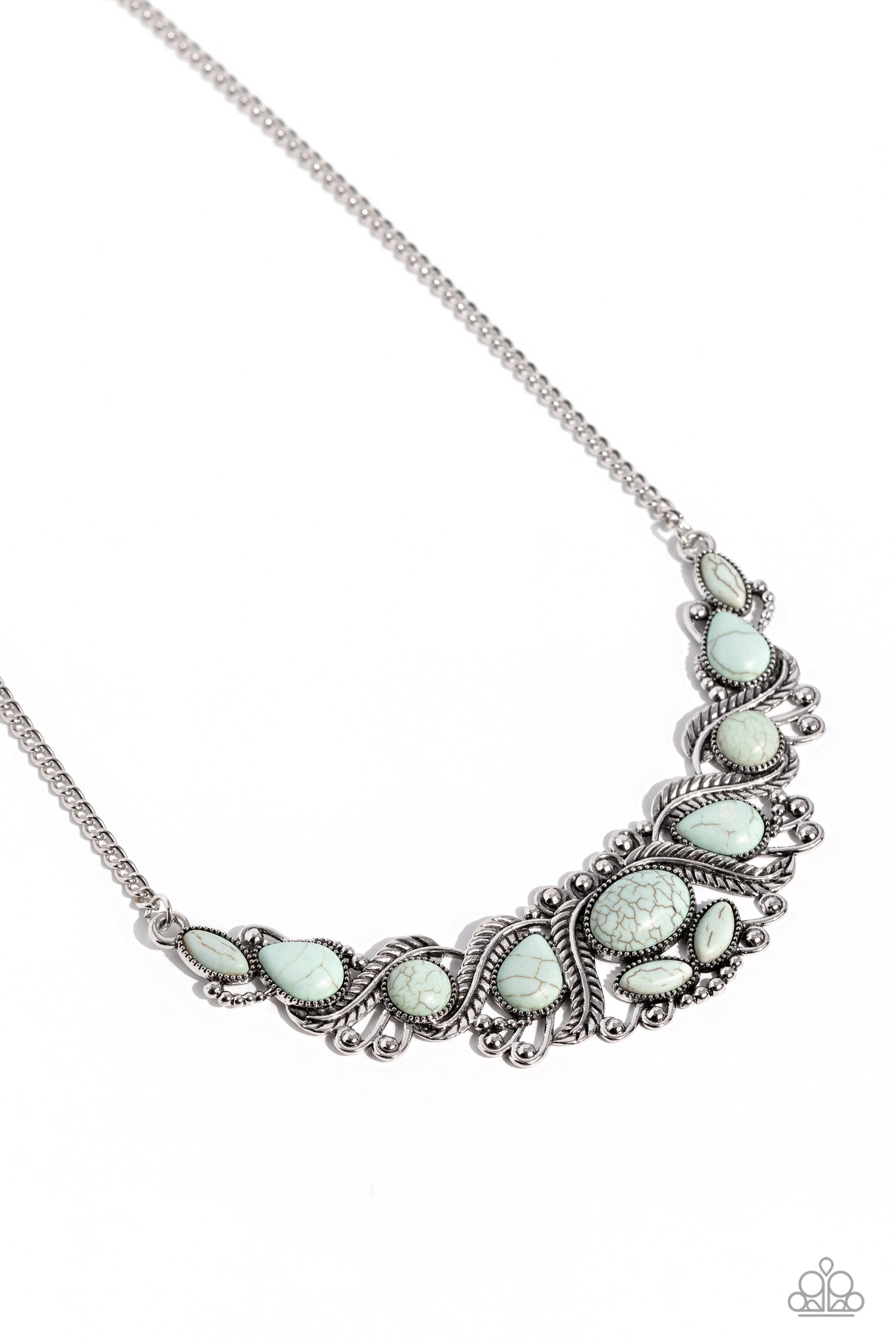 Ornate, elongated silver feathers fan out from light blue stone centers. Silver studs curl around the stony centerpieces, as well as the feathers, for a Southwestern style. Additional curls of silver, with studs in their centers, grace the eye-catching stony frame around the neckline. Features an adjustable clasp closure. As the stone elements in this piece are natural, some color variation is normal.