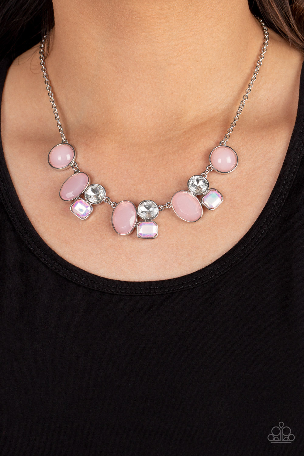 Opaque Baby Pink beads in perfectly polished circles and faceted ovals are pressed into silver frames as they connect with exaggerated classic white rhinestones stacked above emerald cut iridescent gems to create an intricate geometric display. Features an adjustable clasp closure. Due to its prismatic palette, color may vary.
