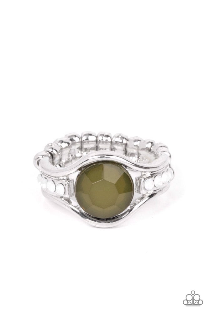 A dewy Olive Branch rhinestone seemingly floats inside the airy center of a band of opal white rhinestones, resulting in an enchanting pop of color atop the finger. Features a dainty stretchy band for a flexible fit. Sold as one individual ring.
