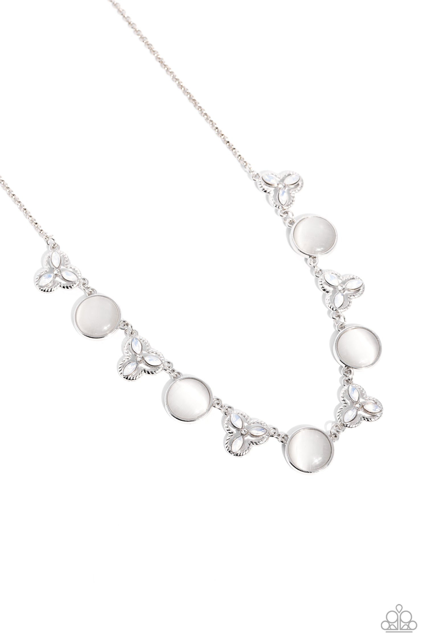 Modeled after trillium flowers, three marquise-cut gems with an opalescent finish bloom around dainty white rhinestones in airy silver frames. Pressed into shiny silver frames, white cat's eye stones glimmer in between the florals for a royally whimsical display below the collar. Features an adjustable clasp closure.