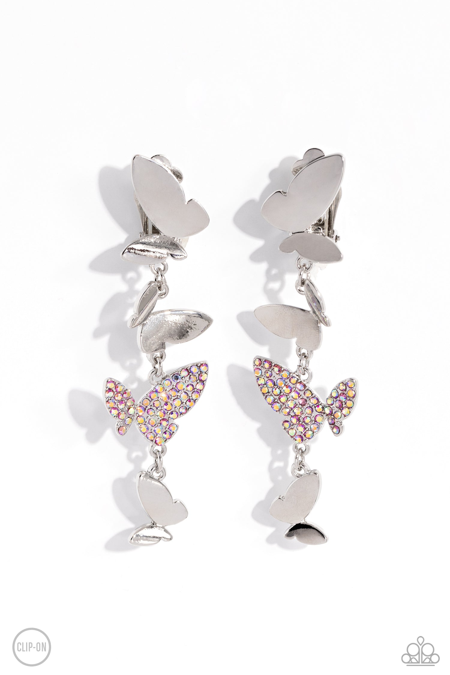 Three butterflies with high-sheen silver wings and one pink iridescent-encrusted butterfly flutter down the ear, creating a free-spirited lure. Each butterfly swings in whimsical asymmetry, creating the look of butterflies flying in alternating directions. Earring attaches to a standard clip-on fitting. Due to its prismatic palette, color may vary.