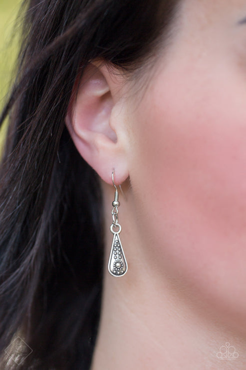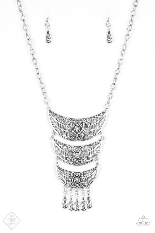 Gradually decreasing in size down the chest, decorative silver crescent plates connect into a bold pendant. Dotted in dainty studs, teardrop silver frames swing from the bottom of the tribal inspired pendant for a fierce finish. Features an adjustable clasp closure.