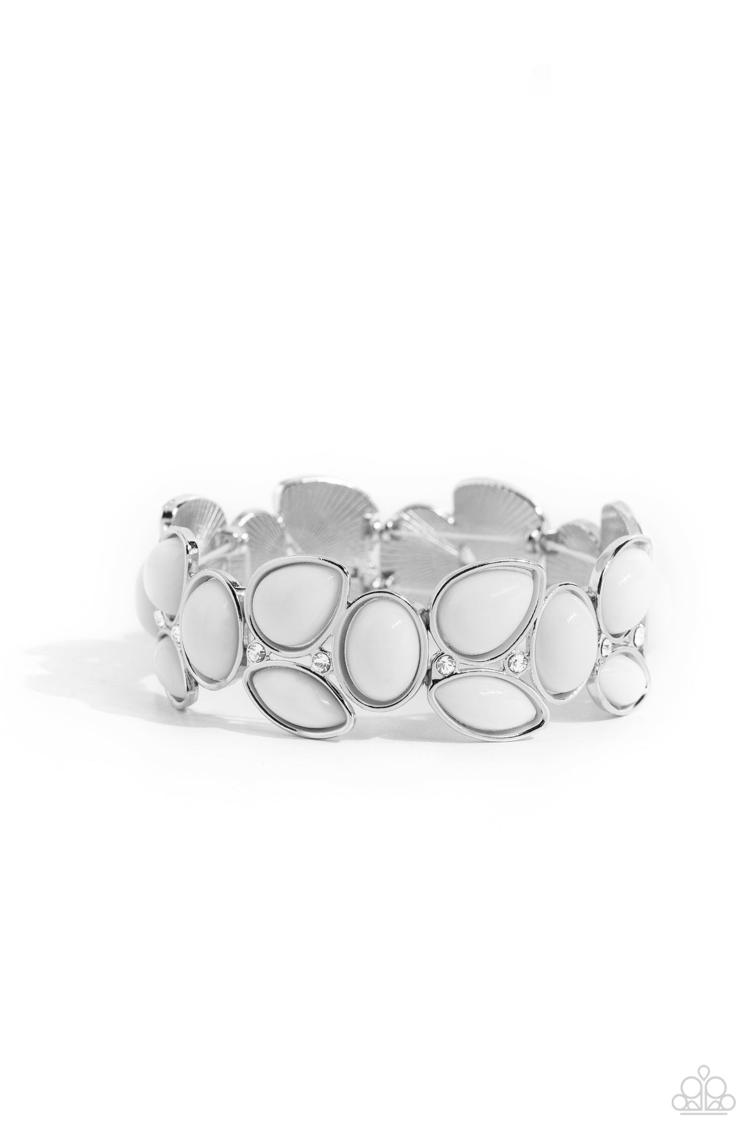 Glassy white rhinestones are sprinkled between bubbly clusters of white oval, teardrop, and marquise shaped beads that are threaded along stretchy bands around the wrist for a colorfully leafy finish.