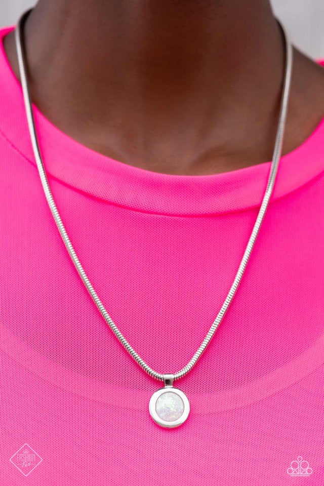 A shimmery white bead, infused with flecks of iridescence and wrapped in a thick silver frame, slides effortlessly along a thick silver snake chain, creating an irresistible pendant. Features an adjustable clasp closure. Due to its prismatic palette, color may vary.