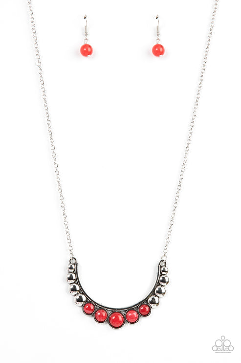 Flat silver beads fade into cloudy red stone beads as they bow into a half moon at the bottom of a curved silver bar, creating an ethereal pop of color at the bottom of an extended silver chain. Features an adjustable clasp closure.