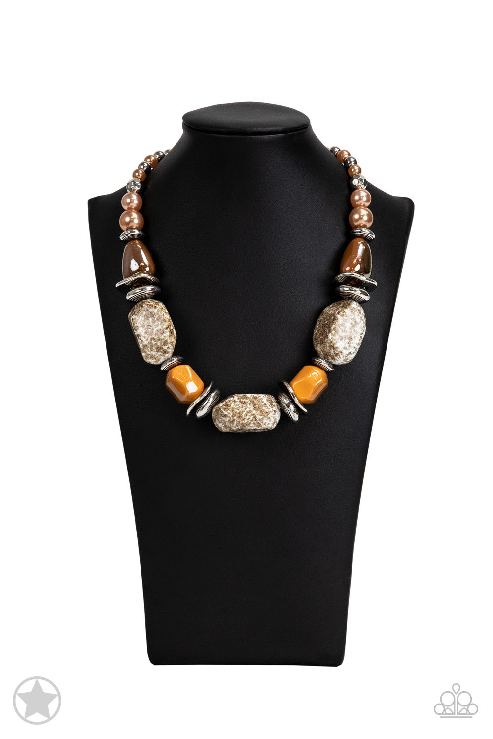 Chunky amber and peach beads with a beautiful glazed finish are complemented by large speckled faux rocks and pearly brown beads. Features an adjustable clasp closure.
