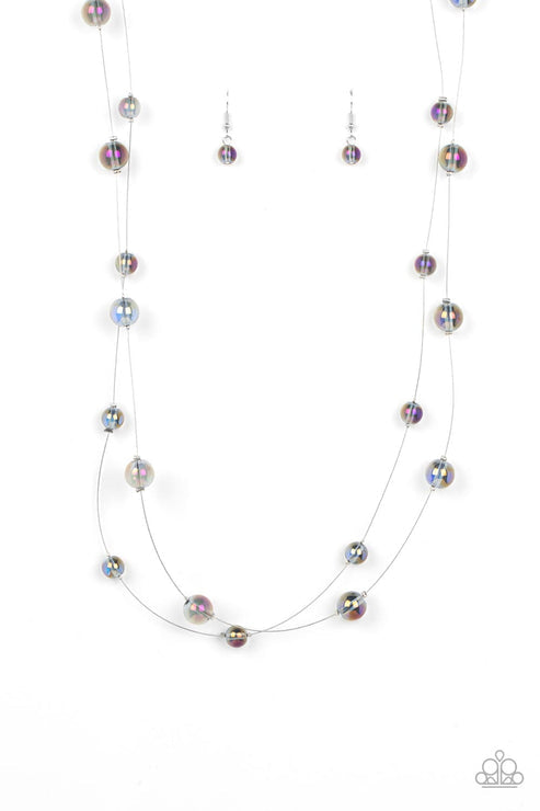 Glassy, purple beads sporadically dot two strands of skinny wire, creating the illusion of floating spheres falling down the chest. One side of each marble-like bead is dipped in a silver coating, adding a hint of metallic shimmer to the abstract design. Features an adjustable clasp closure. Due to its prismatic palette, color may vary.