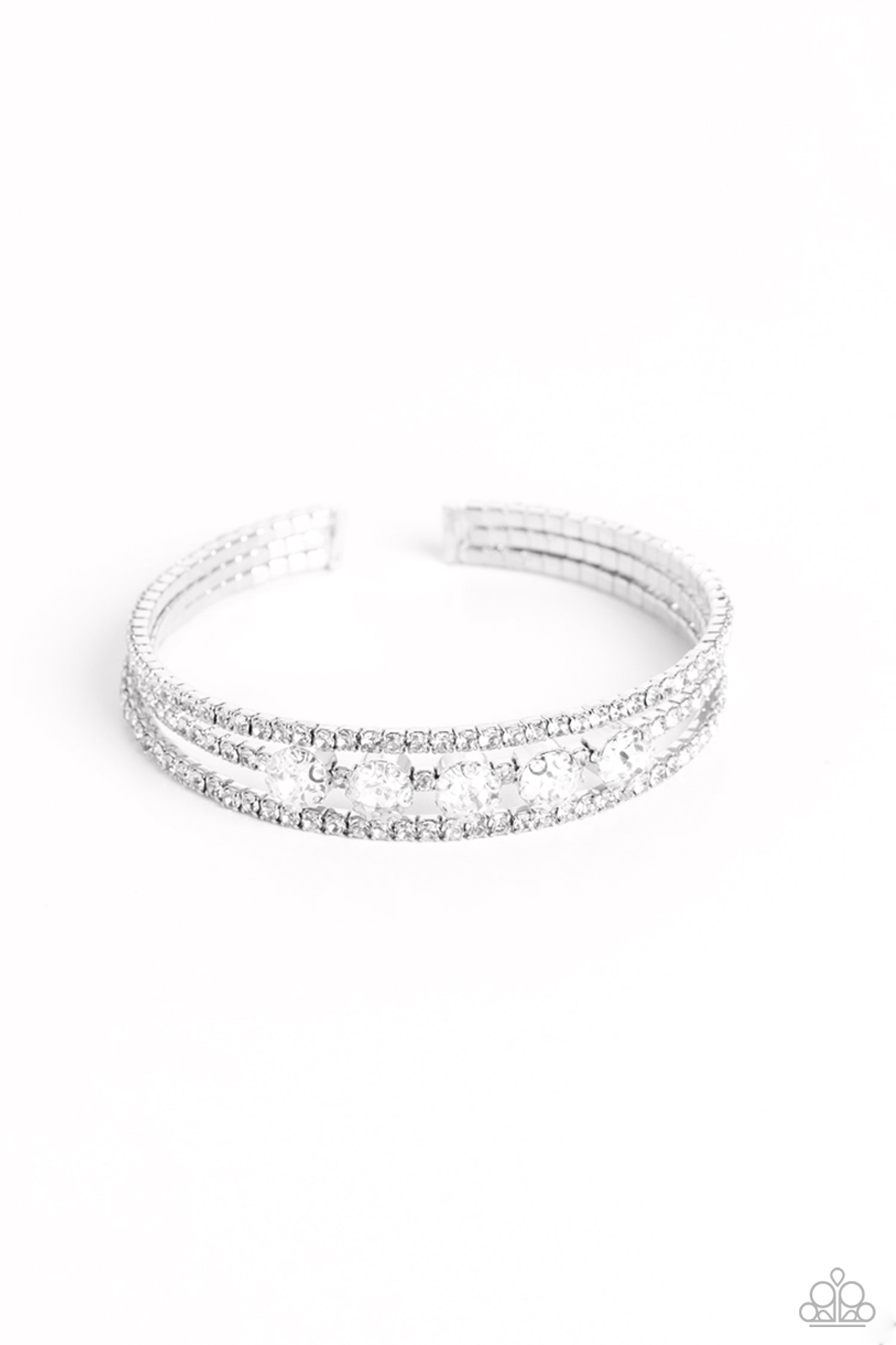 Two strands of dazzling dainty white rhinestones, pressed into silver square fittings, flank a center-most dainty rhinestone row, with oversized rhinestones gracing the top. Pressed into silver, cylindrical frames, the white rhinestones create additional sheen with dainty rhinestones decorating each faceted edge, coalescing into a sparkly layered cuff around the wrist.