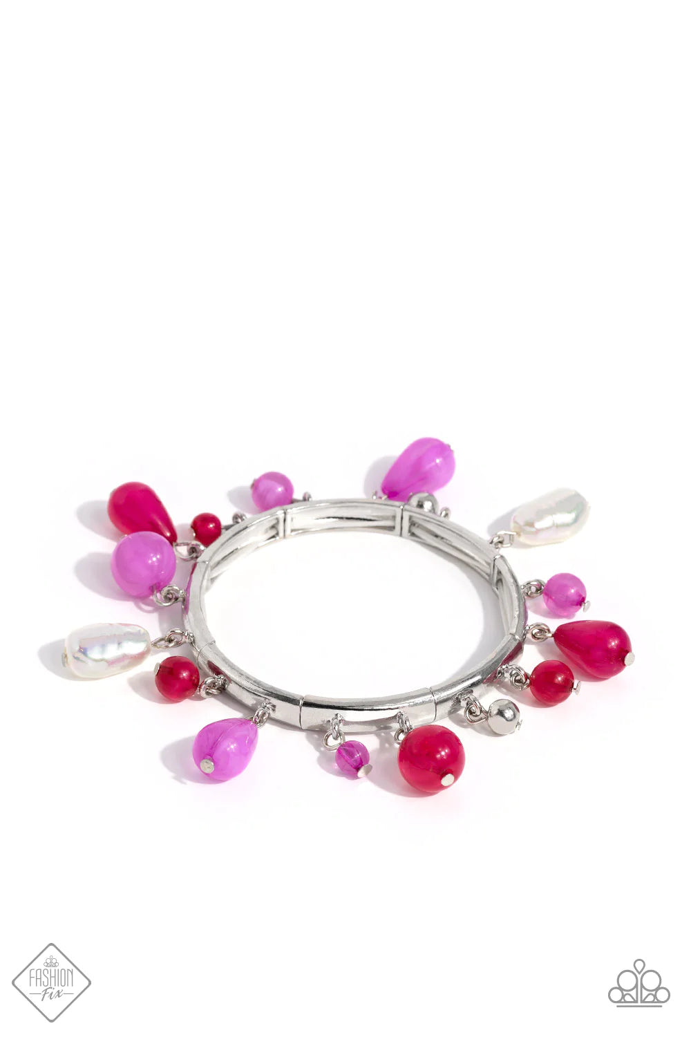 Cloudy Radiant Orchid and Viva Magenta beads, silver beads, and iridescent-dipped baroque pearls elegantly drip along silver frames stretched together on elastic stretchy bands around the wrist, creating a whimsically-clustered display. Due to its prismatic palette, color may vary.