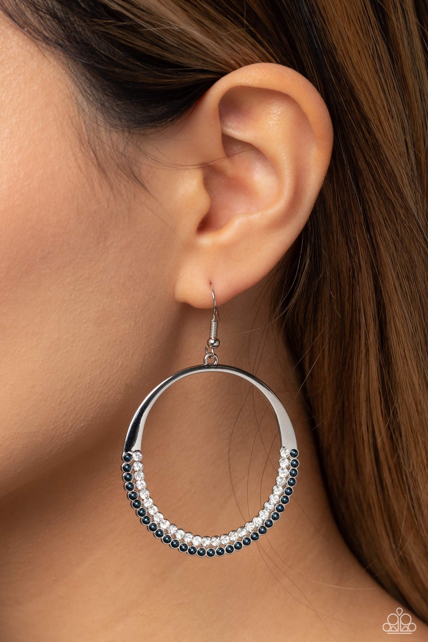 Encrusted on the lower curve of an oversized, dainty silver hoop, two dainty rows of white gems and classy Montana pearls add a subtle shimmer and refinement to the high-sheen statement piece. Earring attaches to a standard fishhook fitting.