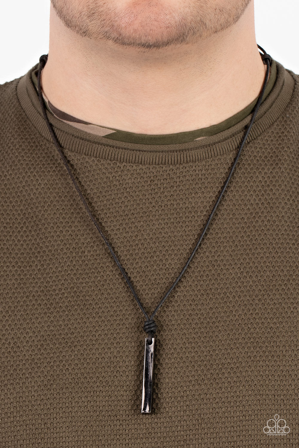 A rectangular gunmetal pendant is knotted in place along a black suede cord, resulting in an edgy pendant. Features an adjustable sliding knot closure.