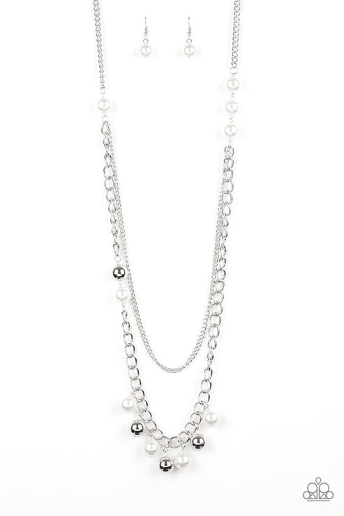 A collection of oversized white pearls gives way to mismatched layers of silver chains down the chest for an asymmetrical look. Dotted with oversized white pearls and shiny silver beads, a matching beaded fringe swings from the bottom of the lowermost chain for a modern twist. Features an adjustable clasp closure. Sold as one individual necklace. Includes one pair of matching earrings.
