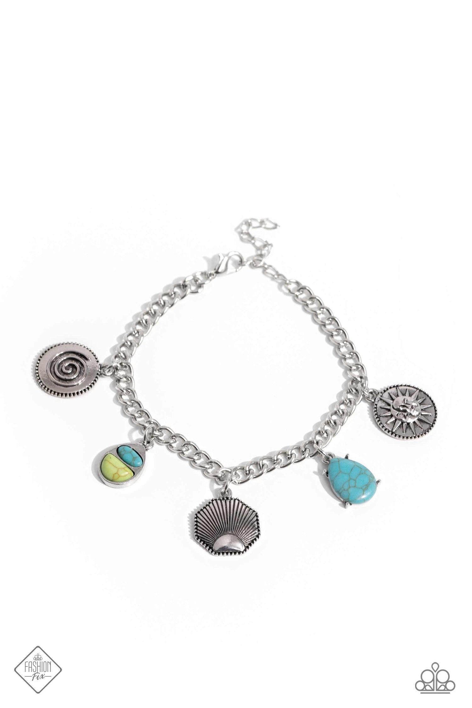 An eclectic display of stony charms and nature-inspired accents dances along a silver chain, creating a boisterous display around the wrist. The hodgepodge of texture and sheen includes silver discs adorned in a linear texture, spiral, sun, and moon-accented discs, and turquoise and green stones emanating from various fittings and frames. Features an adjustable clasp closure. As the stone elements in this piece are natural, some color variation is normal.