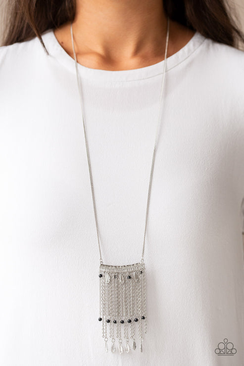 Attached to a lengthened silver chain, a hammered silver bar gives way to a fringe of shimmery silver chain, dainty black beads, and silver feather frames for a seasonal look. Features an adjustable clasp closure.