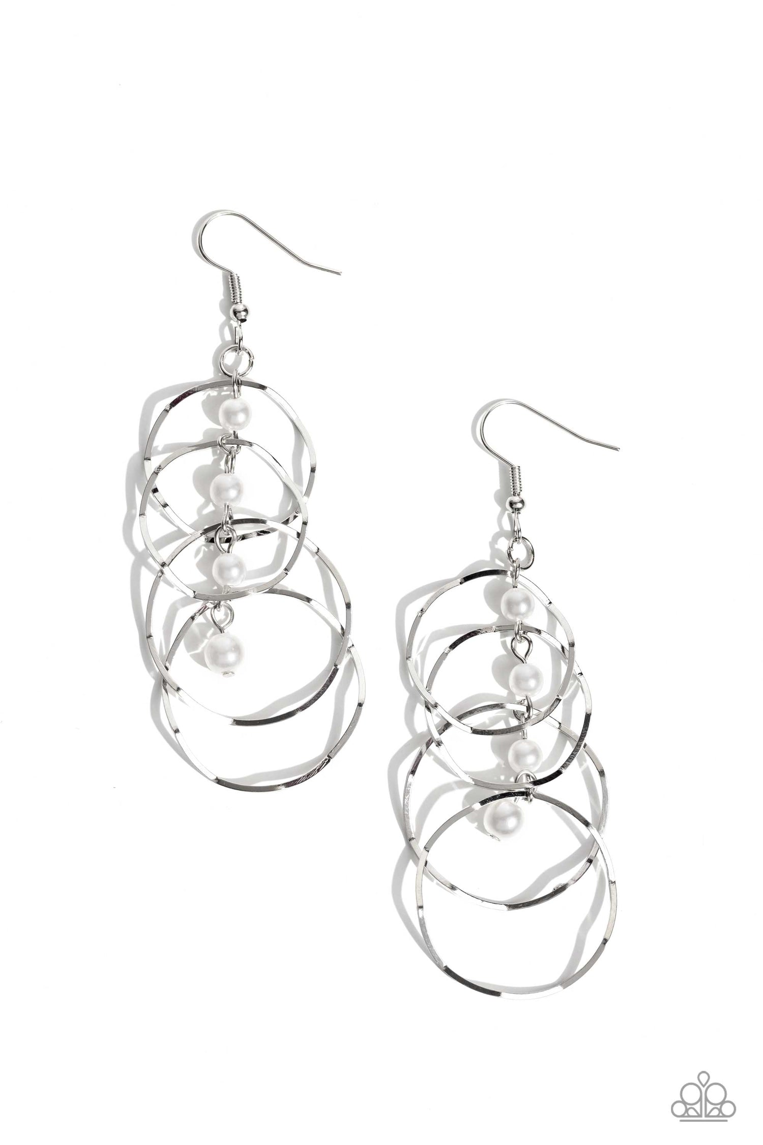 Zigzagging silver hoops trickle from a dainty strand of white pearls, overlapping into a bubbly lure. Earring attaches to a standard fishhook fitting.
