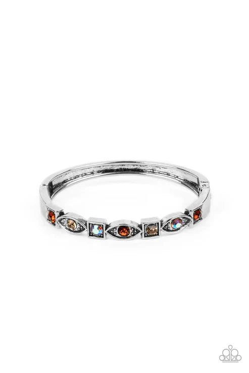 A collection of square and marquise-shaped frames arc across the wrist in a stunning geometric display. Tea, light topaz, and iridescent rhinestones are pressed into the centers of the thick silver frames, adding irresistible sparkle to the bangle-inspired design. Features a hinged closure. Due to its prismatic palette, color may vary.