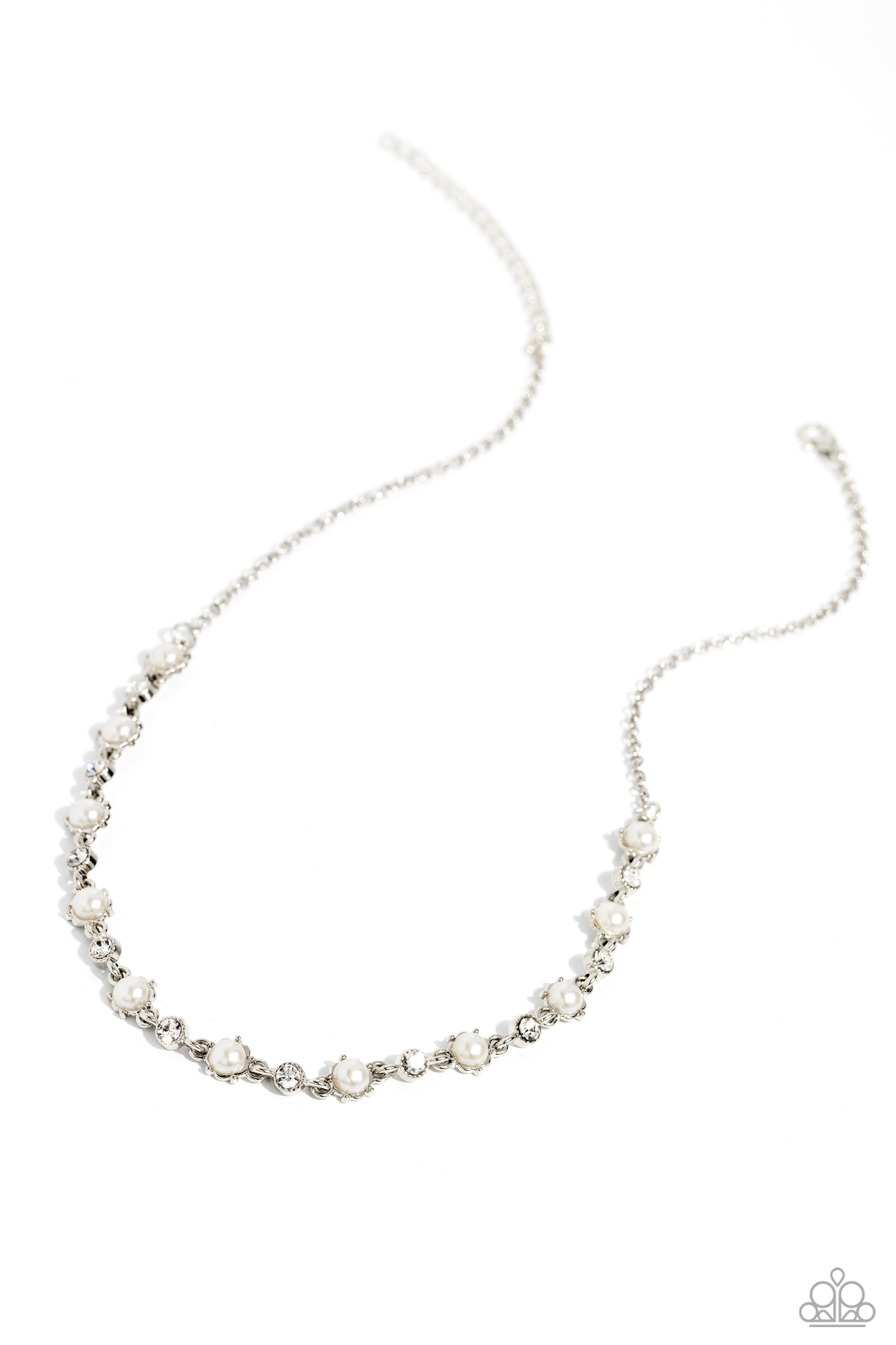 Encased in pronged silver frames, round white pearls and white gems delicately connect and alternate below the collar on a dainty silver chain for a seasonal flair. Features an adjustable clasp closure.