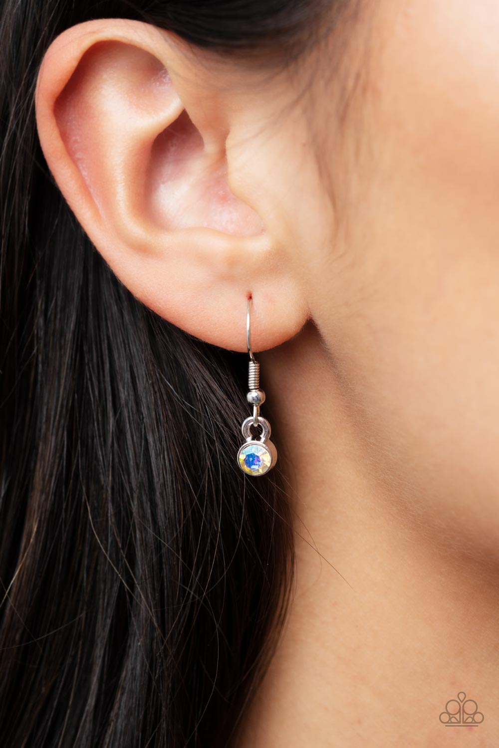 Encrusted with iridescent rhinestones, mismatched silver rings, oval fittings, and an oversized hoop delicately link into a sparkly pendant at the bottom of an extended silver chain. A lobster clasp hangs from the bottom of the design to allow a name badge or other item to be attached. Features an adjustable clasp closure.