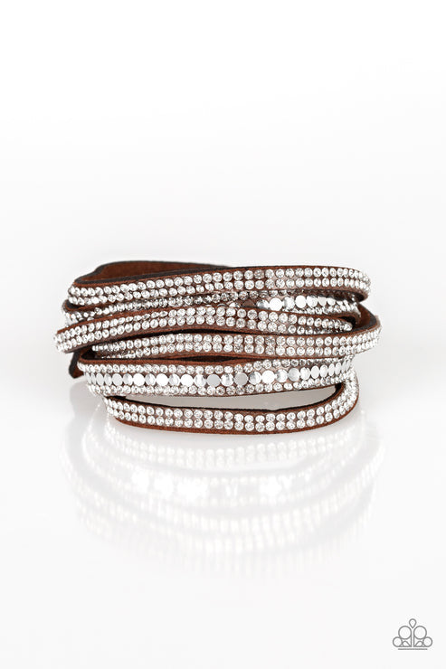 Encrusted in rows of glassy white rhinestones and flat silver studs, three strands of brown suede wrap around the wrist for a sassy look. The elongated band allows for a trendy double wrap around the wrist. Features an adjustable snap closure.