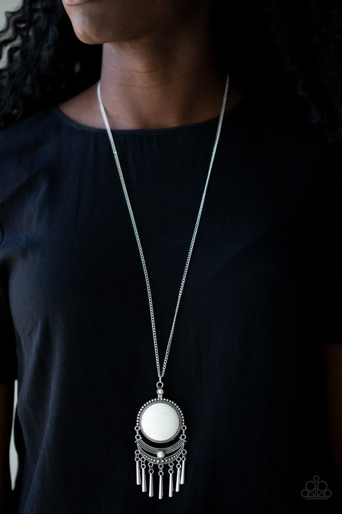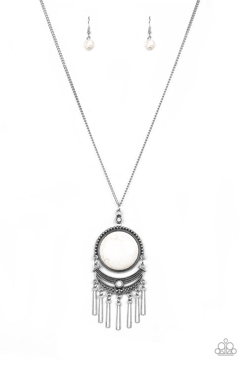 Swinging from the bottom of a lengthened silver chain, a dramatic gray stone gives way to an ornate crescent shaped frame dotted with a dainty gray stone. Brushed in an antiqued shimmer, flared silver bars swing from the bottom of the dramatic pendant, adding a playful movement to the seasonal palette. Features an adjustable clasp closure.