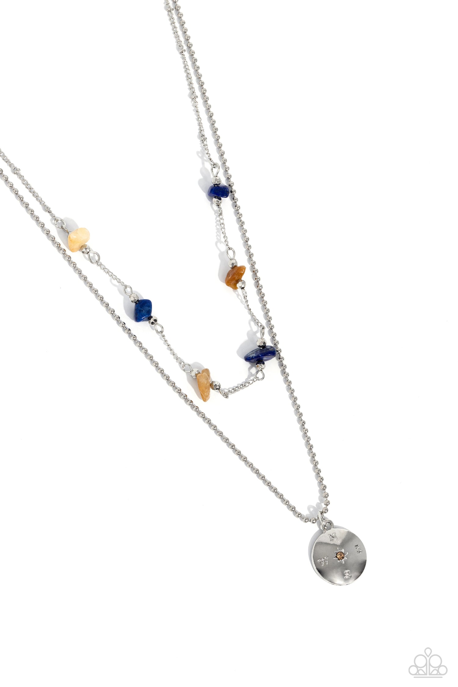 Threaded along a silver satellite chain, chiseled lapis and yellow stones fall along the collar in a grounded pattern. A delicate silver ball chain featuring a dangling silver pendant with compass details and a peachy center layers with the earthy stones for a wanderlust combo. Features an adjustable clasp closure. As the stone elements in this piece are natural, some color variation is normal.