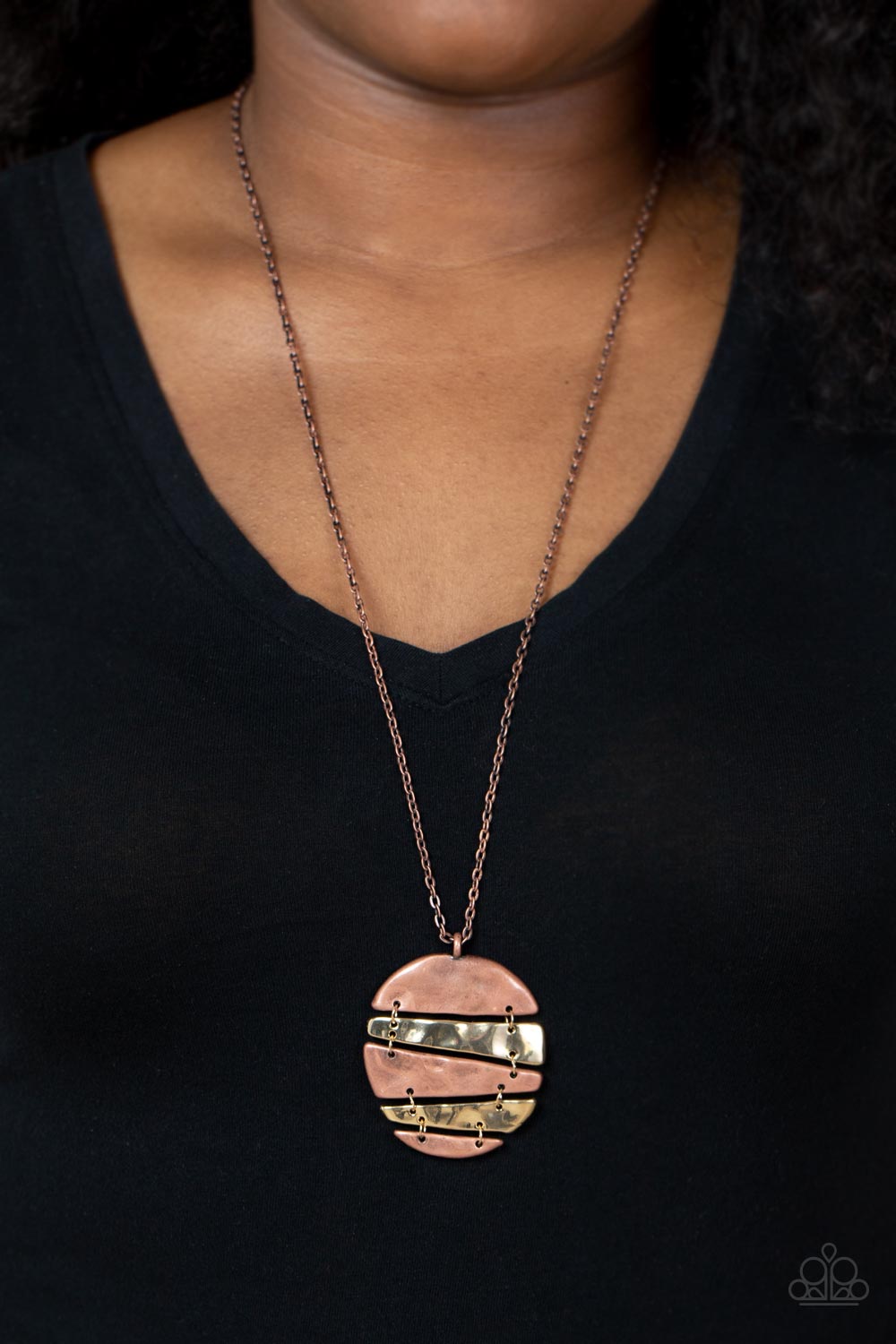 Slices of hammered copper and gold frames link into an abstract mixed metallic palette at the bottom of a lengthened copper chain, creating an edgy centerpiece. Features an adjustable clasp closure.