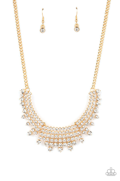 Shimmery strands of multi-sized white rhinestones majestically morph into gold framed layers along the collar for a sparkling statement piece. Features an adjustable clasp closure.