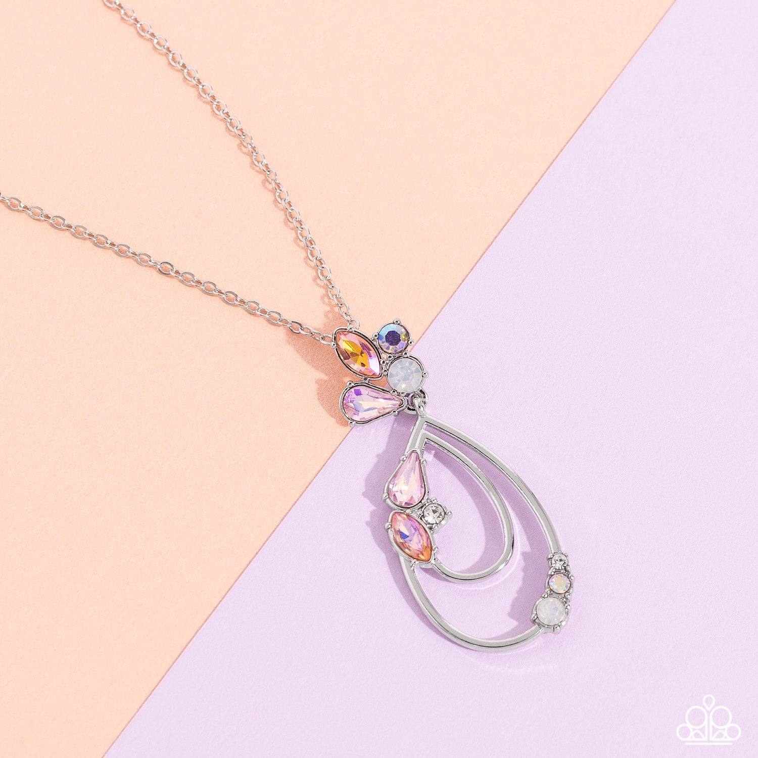 An airy collection of teardrop hoops hangs from a dainty silver chain. Infused along the varying sizes of teardrop hoops, a collection of iridescent, white, and opalescent rhinestones mix with orange and peachy-hued marquise and teardrop-cut gems for a refined pop of color. Featured above the hoops, a collection of marquise, round, and teardrop-cut rhinestones and gems in similar shades as the dreamy collection infused on the hoops, stands out for additional shimmer and shine. Features an adjustable clasp closure. Due to its prismatic palette, color may vary.
