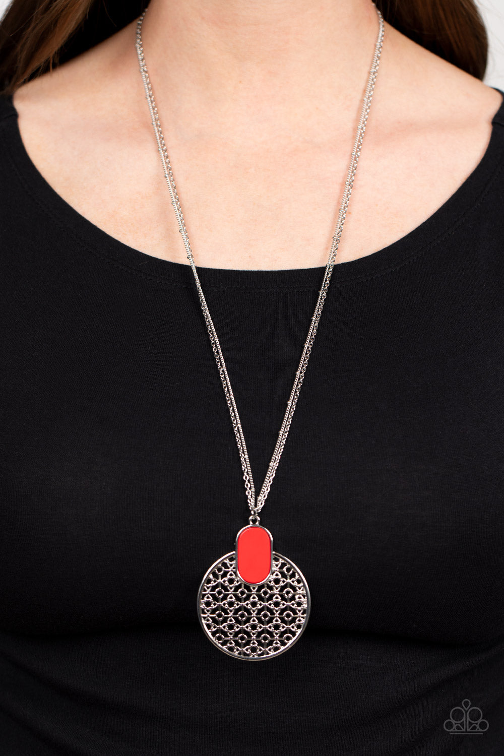 Featuring a faux shell finish, a flat red accent piece embellishes the top of an oversized silver circle filled with an airy decorative motif. The colorful pendant glides on a classic silver chain and dainty silver satellite chain, creating a whimsical display. Features an adjustable clasp closure.