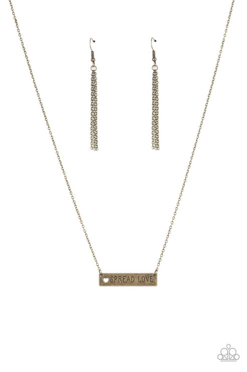 Featuring a dainty heart cutout, an antiqued brass plate is stamped in the phrase, "Spread Love," creating an inspirational phrase below the collar. Features an adjustable clasp closure.