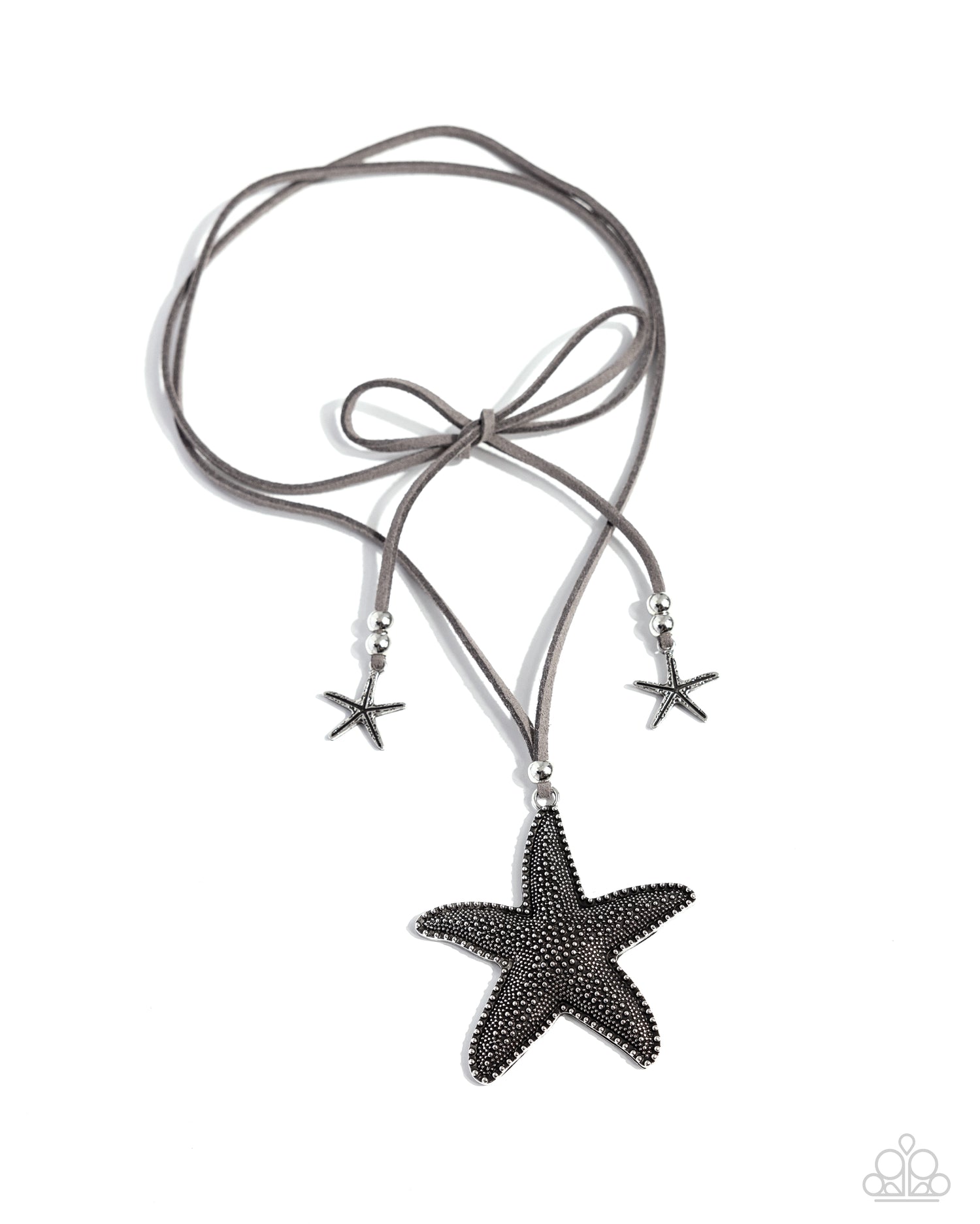 Infused with silver beaded and studded oversized starfish accents, a lengthened strip of gray suede double wraps around the neck, creating a layered choker necklace. Two whimsical silver starfish charms swing from the ends as a silver bead slides up and down the suede strands, adjusting the length of the coastal piece.