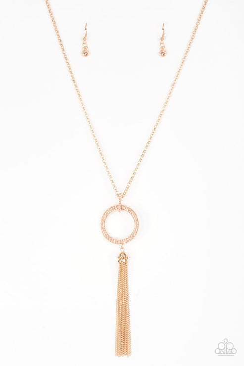 Encrusted in dazzling peach rhinestones, a shimmery gold hoop swings from the bottom of an elegantly elongated gold chain for a refined look. A glistening gold tassel swings from the bottom of the glittery pendant for a flirty flair. Features an adjustable clasp closure.